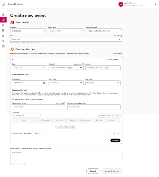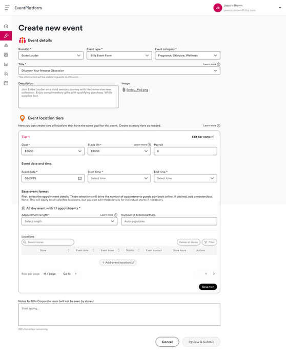 Ulta Beauty required a centralized Event Management Platform to streamline the way brand events and selling support activations are proposed, approved, tracked, and reported across hundreds of store locations. Prior processes were fragmented across emails, spreadsheets, and outdated tools, creating visibility gaps, data inconsistency, and long approval cycles for both internal teams and external brand partners.